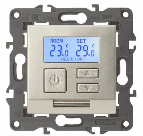 Универсальный терморегулятор ЭРА Elegance в цвете шампань предназначен для регулирования температуры в помещениях. Он работает при напряжении 230В и имеет максимальный ток 16А. Защита от влаги и пыли соответствует классу IP20, что обеспечивает безопасность использования. Этот терморегулятор подходит для различных типов обогревательных систем и обеспечивает комфортный уровень тепла в помещении.