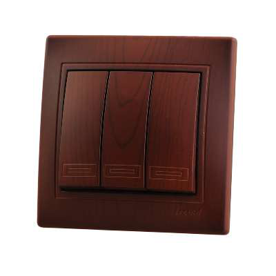 Выключатель тройной. Изделия с расцветкой «под дерево» изготовлены из покрашенного «под фактуру» пластика, а не оклеены цветной пленкой.Безопасные для рук крепежные выступы с пружиной и возвратом в исходное положение. Серебряные контакты, выполнены по стандарту из сплава.