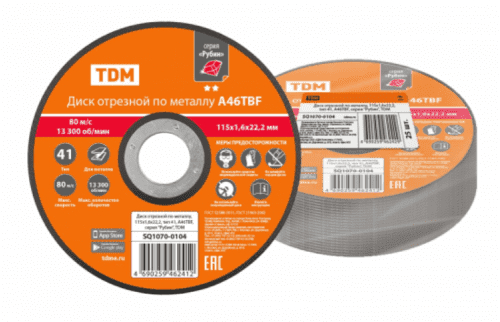 Диск отрезной по металлу, 115х1,6х22,2, тип 41, A46TBF, серия Рубин, TDM - это надежный и эффективный инструмент, который поможет вам быстро и качественно выполнять работы по обработке металла.