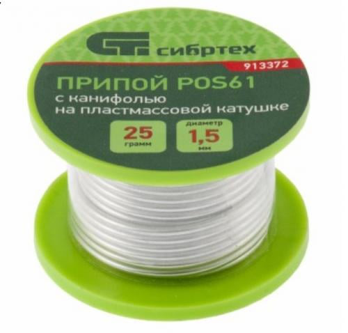 Припой с канифолью Сибртех D 1,5мм, 25 г, POS61, на пластмассовой катушке - это качественный припой для пайки электронных компонентов, проводов и других металлических деталей. Имеет диаметр 1,5 мм, что обеспечивает удобство при работе. Канифоль в составе припоя облегчает процесс пайки, улучшает сцепление и уменьшает вероятность появления окислов на металлических поверхностях. Упакован в удобную пластмассовую катушку весом 25 г, что делает его удобным в использовании и хранении. Подходит как для профессионального использования, так и для домашнего мастера.