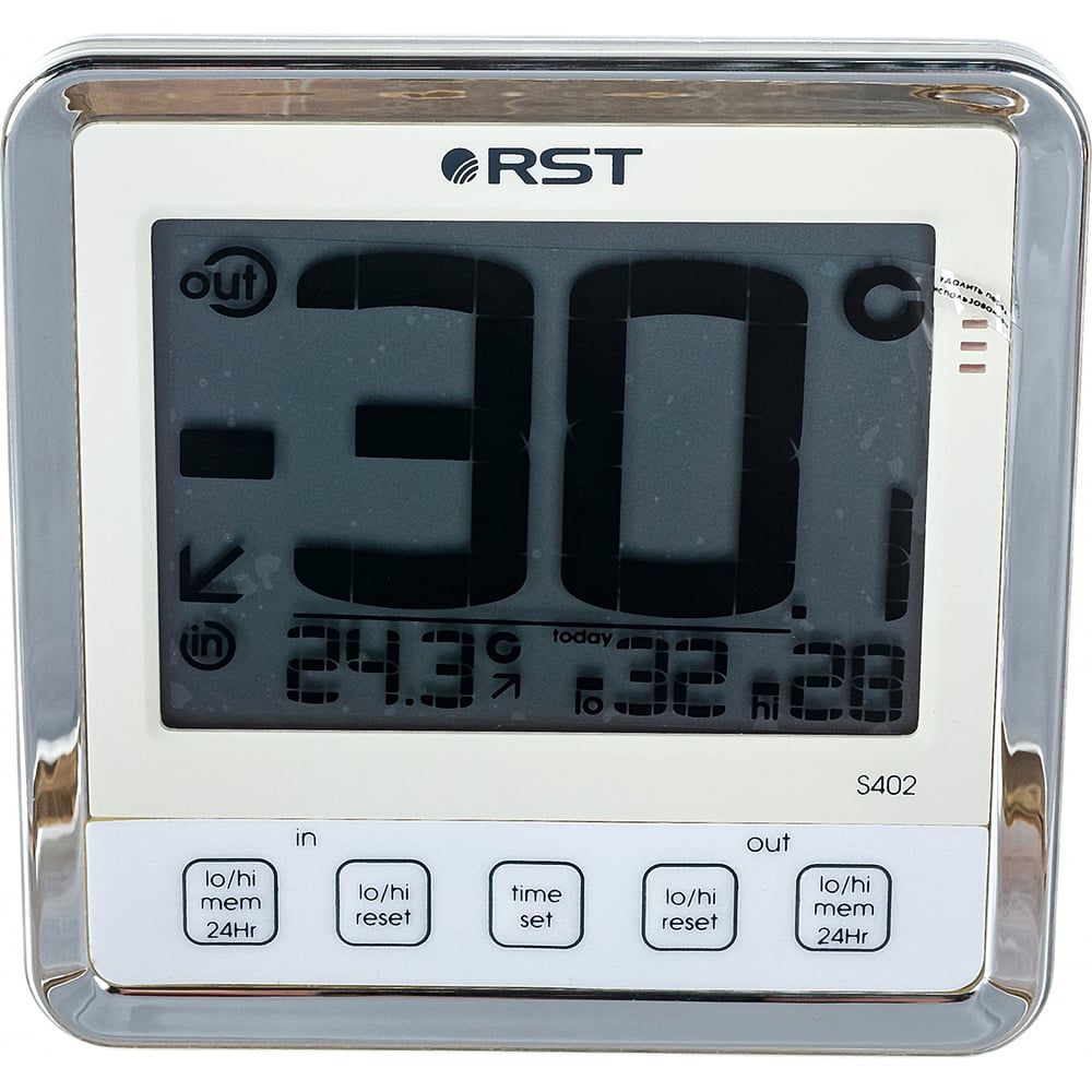 Цифровой термометр с большим дисплеем RST, дом-улица RST02402 определяет внутреннюю и внешнюю температуру воздуха, отображает тенденцию их изменения, сигнализирует об опасности гололеда. Представляет собой электронный термометр с большим дисплеем, сенсорной панелью управления и в корпусе с хромированным ободком по периметру. Может крепиться на подставке или стене. Сохраняет в памяти максимальные и минимальные значения за текущие сутки и за весь период с возможностью сброса показаний. Внешняя температура измеряется при помощи выносного термосенсора на проводе, который легко выводится на улицу и прижимается оконной рамой.