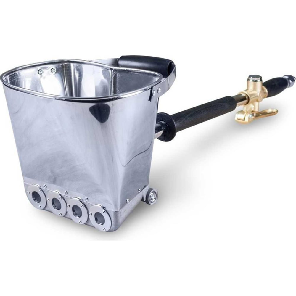 Штукатурный стеновой хоппер-ковш TeaM Промышленник К350 значительно облегчает работу штукатуров. Состоит из контейнера, куда заливается раствор, а также трубки-держателя с клапаном для сжатого воздуха и разъемом.Долговечность. Контейнер выполнен из металла, что обеспечивает повышенную прочность и долгий срок службы.Хоппер для нанесения штукатурки работает от компрессора; штукатурный раствор подается под давлением по шлангу (обычно диаметром 10 мм), а затем через сопла разбрызгивается по поверхности основания.Дно ковша имеет небольшую ширину, чтобы давления воздуха было достаточным для разбрызгивания смесиК ковшу крепится прорезиненная ручка и пусковой механизмПродолжительная работа. Пневматический инструмент рассчитан на работу в течение длительного периода времени без остановки.Расстояние при нанесении материала может составлять 5-10 см.Рекомендуемый тип соединения Geka (в комплект не входит)Штукатурный ковш можно использовать при оштукатуривании стен и потолков любых помещений. Благодаря высокой продуктивности инструмента можно оштукатуривать большие площади за короткие промежутки времени.Помимо штукатурных растворов, хоппером можно наносить жидкие обои, фактурные краски, пробковую штукатурку.