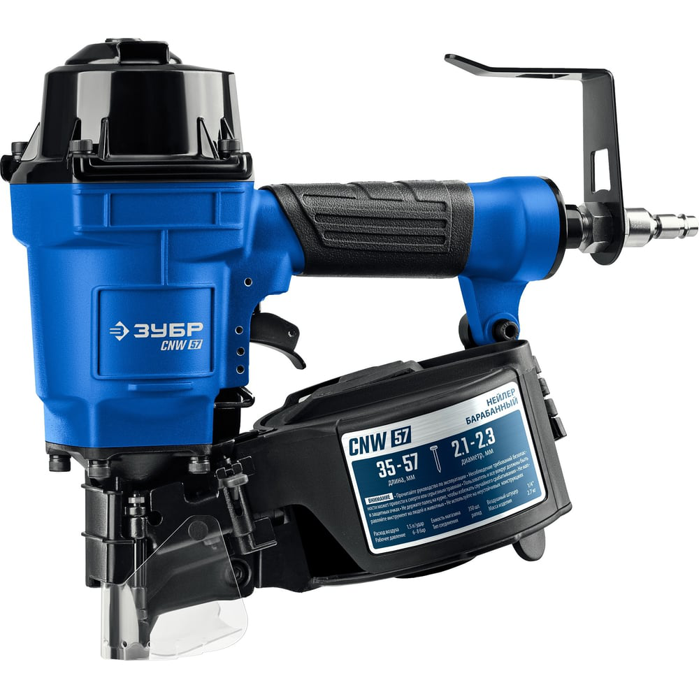 ЗУБР Профессионал CNW-57 Пневматический нейлер для барабанных гвоздей 31910 предназначен для производства паллет (поддонов) и других изделий из дерева, таких как тара, ящики и упаковка с гвоздями длиной 35-57 мм барабанного типа.