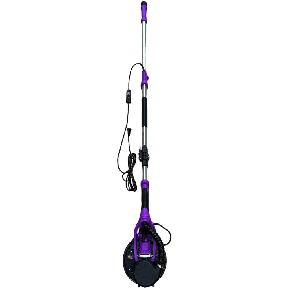 Шлифовальная машина с системой пылеудаления оснащена турбиной с регулировкой вакуума и светодиодной подсветкой рабочей зоны. Плавная регулировка скорости вращения от 500 до 2700 об/мин. Предназначена для шлифования стен и потолков после нанесения раствора, а также для удаления старой краски, остатков от старых обоев и т.д. Мощность шлифовальной машины 1380 Вт, что превышает минимальные требования в 500 Вт. Большая мощность двигателя положительно сказывается на ресурсе инструмента. Съемный край контура защитного кожуха тарелки (шасси) позволяет увеличить эффективность и уменьшить ручной труд (обработка поверхности у стыков и углов на 4 см больше). Телескопическая рукоятка с регулировкой длины позволяет работать со стенами и потолком высотой до 3 метров стоя на полу. Конструкцией машинки также предусмотрено вращение «головы» в разные стороны с углом наклона до 120 градусов. Подошва машинки оснащена тарелкой с липучкой для быстрой смены шлифовальной бумаги. Шлифовальная машина имеет складную конструкцию, что делает транспортировку и хранение более удобными.