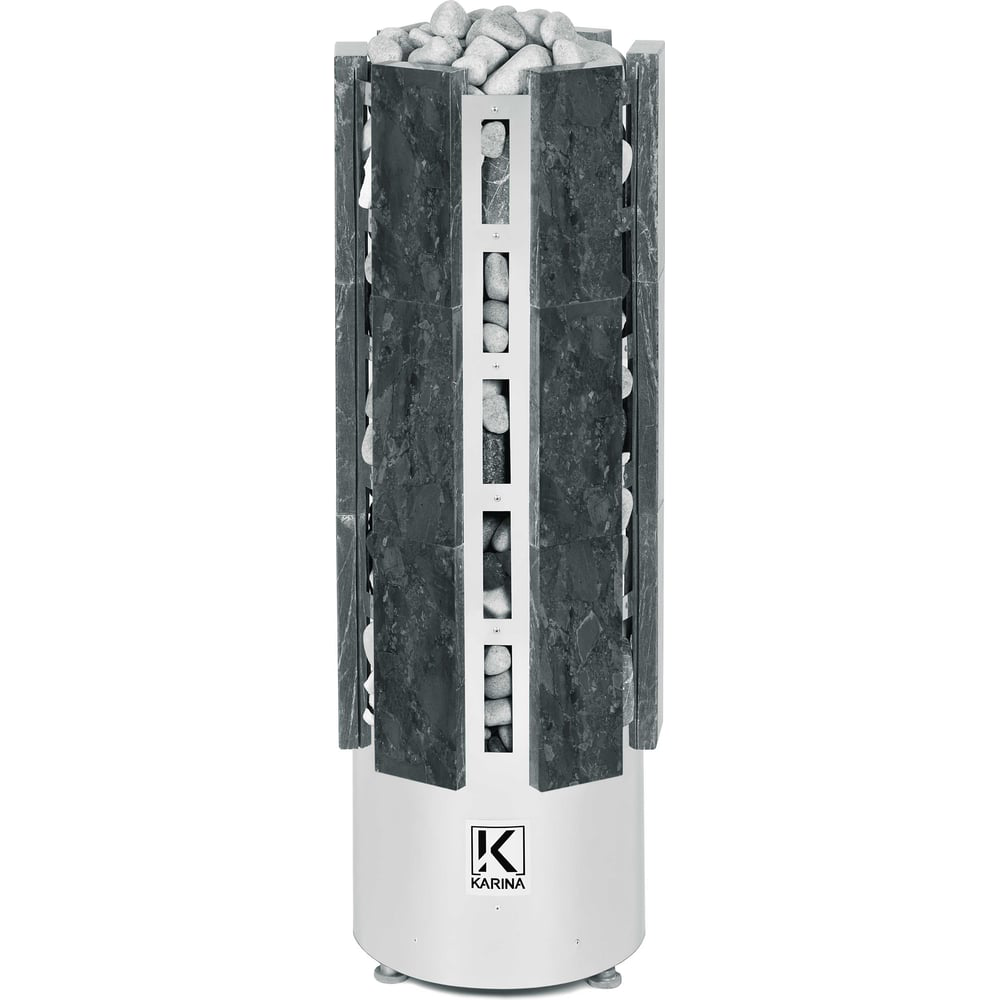 Электрокаменка Karina Forta 18 Онего Грин выполнена в напольном варианте и обладает цилиндрической формой дополненной плитами из натурального камня Онего Грина. Напряжение питания - 380В. Данная модель имеет 6 тэнов, расположенных в виде треугольника. В центре внизу расположен бак для воды емкостью 5л, который является парогенератором. Выше парогенератора имеется емкость под мелкие камни или нержавеющие шары объемом 4.7л, вмещающая 10 кг мелкого камня это - закрытая каменка с воронкой для подачи воды и получения мелкодисперсного пара. Электрокаменка Karina Forta 18 Онего Грин подойдет как финской сауны, так и русской бани.Если в парогенератор не заливать воду, то каменка разогреет парную до высокой температуры (100 -120°C) с относительной влажностью воздуха 10-12% - режим сухой бани (финская сауна). Если залить воду в парогенератор, при разогреве парной вода будет испаряться и увлажнять воздух до режима русской бани (60-70°C и 40-50% влажности). В обоих случаях использование закрытой каменки дополнительно прибавит мелкодисперного необжигающего пара.Все корпусные элементы печи выполнены из нержавеющей стали. Нагревательный элемент - ТЭН диаметром 10мм. Наружный кожух дополнительно облицован плитами из Онего Грина толщиной 40мм, что придает ей еще большую теплоемкость и меньшее излучение от металлических элементов, которые выжигают воздух в парной. Общий вес камней – 205кг (120кг загрузка камней в печь и 85кг - вес облицовки), что сопоставимо с закладкой камней в дровяную печь.