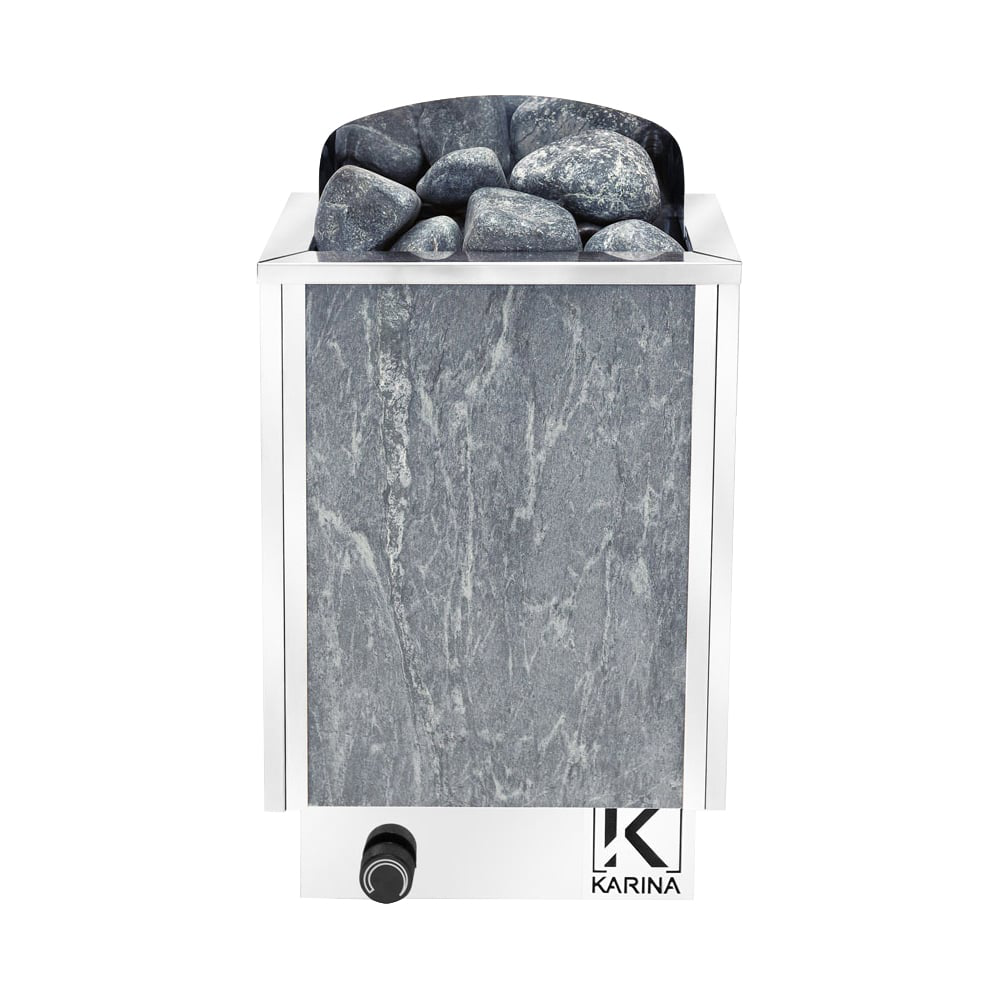 Электрическая печь Karina Trend 2,5 Талькохлорит Tr-2,5-220-T подходит для обогрева домашних бань и саун объемом от 2 до 3 куб.м. Для удобной эксплуатации в комплект поставки входит встроенный пульт управления. С помощью него пользователь легко может регулировать температуру нагрева воздуха. Облицовка из талькохлорита придает устройству стильный и современный вид.