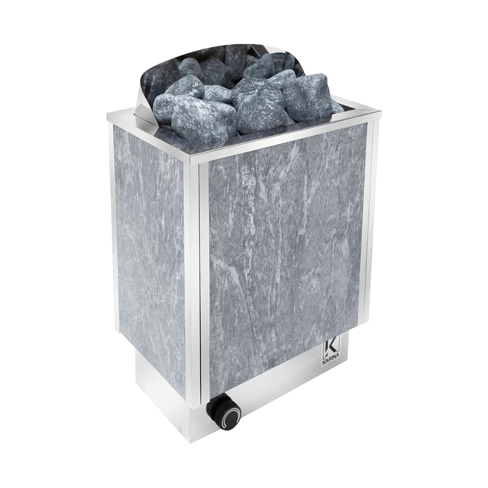 Электрическая печь Karina Trend 7,5 Талькохлорит Tr-7,5-220/380-T подходит для обогрева домашних бань и саун объемом от 12 до 14 куб.м. Для удобной эксплуатации в комплект поставки входит встроенный пульт управления. С помощью него пользователь легко может регулировать температуру нагрева воздуха. Облицовка из талькохлорита придает устройству стильный и современный вид.