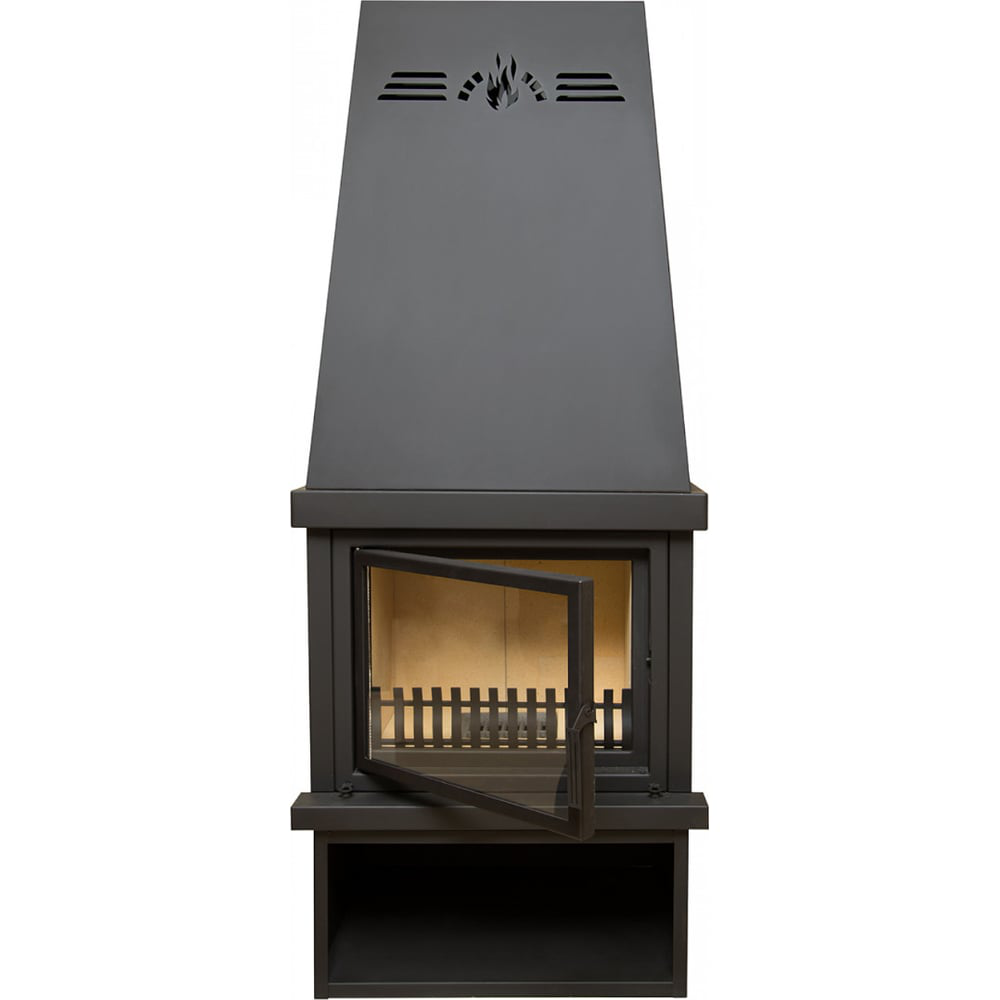 Легкий камин-моноблок, быстрый легкий монтаж и подсоединение к дымоходу. Быстрый конвекционный нагрев помещения площадью 50-100 м2 в зимнее время за 2-3 часа. Большая топочная дверка со стеклом. Идеально подходит для среднего дачного дома как основной источник тепла осенью и весной. Размер поленьев до 50 см. Подсоединение к дымоходу сзади. Время горения 3-5 часов.