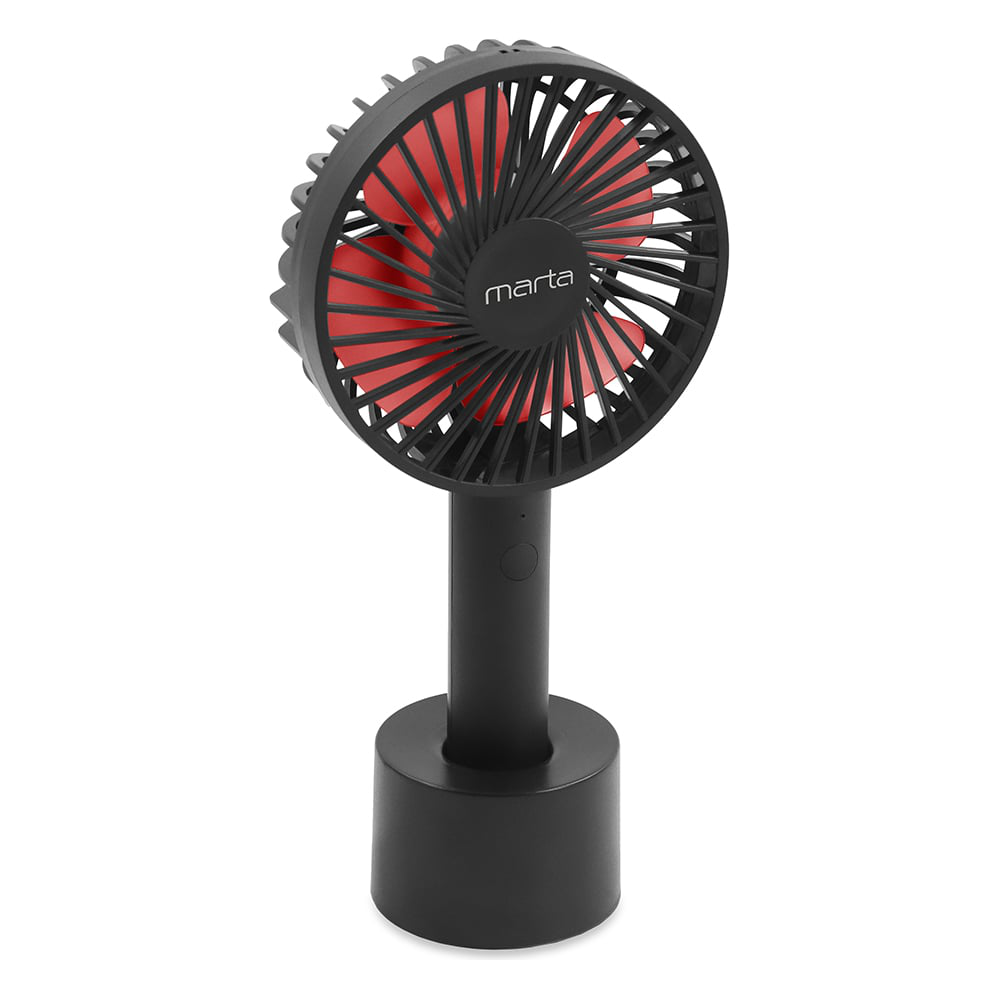 Портативный USB вентилятор Marta работает от встроенного литий-ионного аккумулятора ёмкостью 1800 мА/ч (типоразмер 18650) Время работы от аккумулятора до 5 часов В комплекте идёт подставка для установки вентилятора на стол Три скорости работы LED-индикатор работы и зарядки Зарядка аккумулятора осуществляется от USB порта, кабель USB-microUSB в комплекте Компактные размеры сделает вентилятор незаменимым как дома, так и в дороге