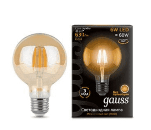 Лампа светодиодная Gauss LED Filament G95 6W E27 2400K(105802006) Цветовая температура: 2400KЦоколь: E27