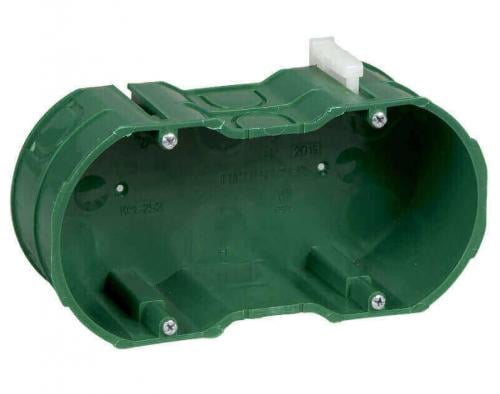 Коробка установочная двухпостовая для сплошных стен. Предназначена для монтажа изделий на винтах и с помощью распорных лапок в сплошные стены и сухие перегородки. Межосевое расстояние 71 мм.