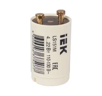 Стартеры тлеющего разряда предназначены для быстрого и надежного зажигания трубчатых люминесцентных ламп, работающих в сети переменного тока частотой 50 Гц. Стартер представляет собой миниатюрную газоразрядную лампу с тлеющим разрядом, которая состоит из колбы, заполненной инертным газом, и двух электродов, размещенных внутри этой колбы. Стартеры IEK серии LS применяются в люминесцентных светильниках и лампах, в том числе светильниках IEK серии ЛСП с электромагнитным балластом одно, двух и четырех лампового исполнения. Стартер последовательного включения LS151M 4…22Вт 110-130В используется для зажигания ЛЛ в двух или четырёхламповом светильнике последовательного включения ламп мощностью лампы от 4 до 22Вт номинальным напряжением 220-240В или одноламповом светильнике с номинальным напряжением 110-130В переменного тока.