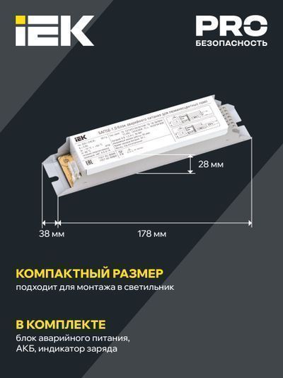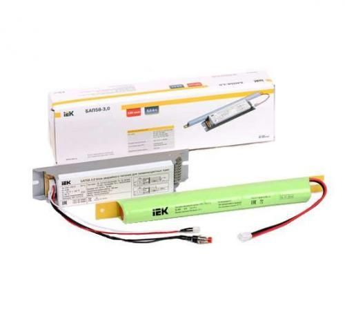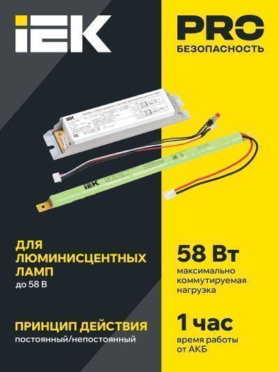 Блок аварийного питания (БАП) предназначен для обеспечения бесперебойного освещения помещений светильниками с люминесцентными лампами в случае непредвиденного отключения сети 230В. БАП встраивается в светильник или в выносной бокс управления люминесцентными лампами серии Т5 и Т8 мощностью до 58Вт, с лампами КЛЛ серии PL-C мощностью до 36 Вт и обеспечивает работу в аварийном режиме одной лампы в светильнике. Блок аварийного питания IEK состоит из электронного пускорегулирующего аппарата (конвертера), герметичной никель-металл-гидридной аккумуляторной батареи, светодиодного индикатора наличия сети и подзарядки аккумулятора, кнопки "ТЕСТ".