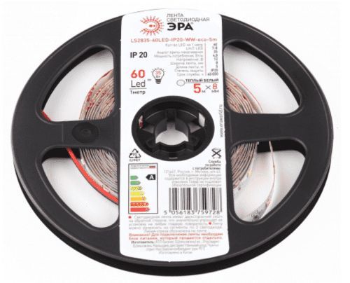 LS2835-60LED-IP20-WW-eco-5m, Б0035587 легко монтируется благодаря своей гибкой конструкции и самоклеящейся основе. Она идеально подходит для использования в декоративном освещении, подсветке мебели, создании световых акцентов и других архитектурных элементов.