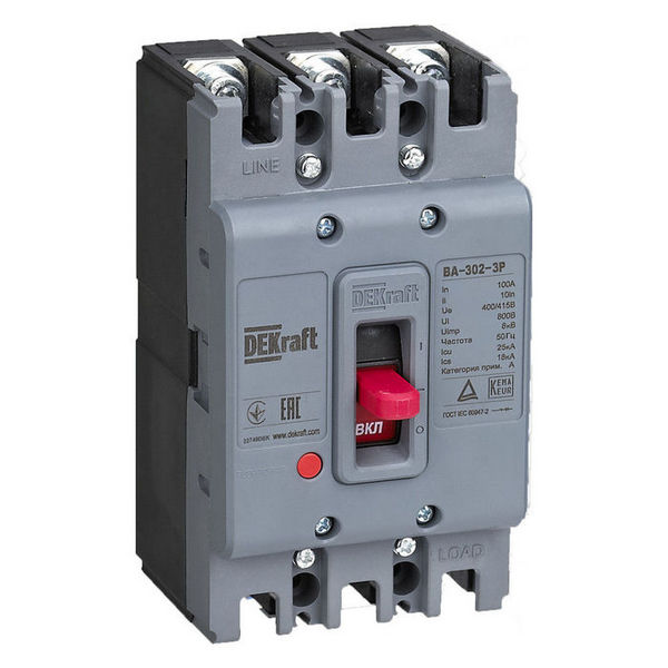 DEKraft 3P 20А 25кА ВА-302, 22802DEK имеет трехполюсную конструкцию, что позволяет использовать его для трехфазных систем электроснабжения.