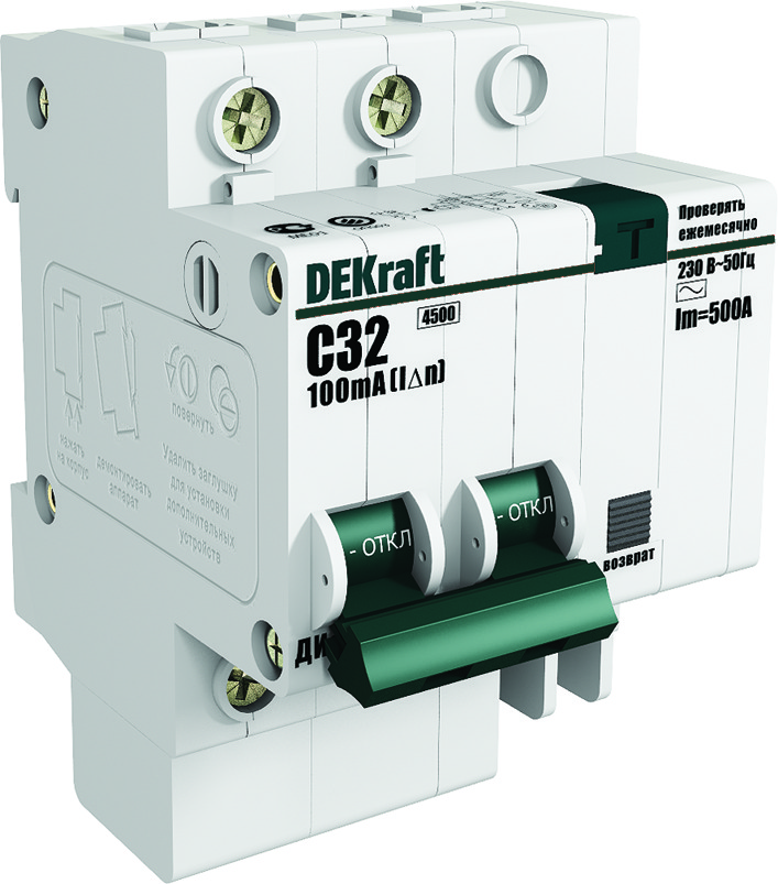 DEKraft ДИФ-101 Дифференциальный автоматический выключатель 2Р 20А 30мА тип AC (С) 4,5кА Защита оконечных однофазных сетей от перегрузок и коротких замыканий, защита от переменного синусиодального тока замыкания на землю, защита при восвенном прикосновении и дополнительная защита при прямом прикосновении; отключение резистивных и индуктивных нагрузок. Применение: жилые помещения, коммерческие и промышленные объекты.